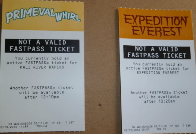 Não adianta sair correndo pelo parque e ir tirando os Fastpass de todas as atrações, pois há um tempo obrigatório de espera entre a retiradas de tickets. Descobri isso na prática. Tirei um Fastpass para a montanha-russa Everest e tentei tirar outro em seguida. A máquina gerou um ticket inválido e informou a partir de que horário eu poderia retirar outro. Eu pensei que este bloqueio acontecia por atração, mas estava enganada. O sistema do parque é integrado e o bloqueio é geral. Tentei tirar o Fastpass do Primeval Whirl e nao consegui, pois tinha tirado um para outro brinquedo havia pouco tempo. Notei que este tempo de bloqueio é de até 2 horas. Geralmente é de uma hora.